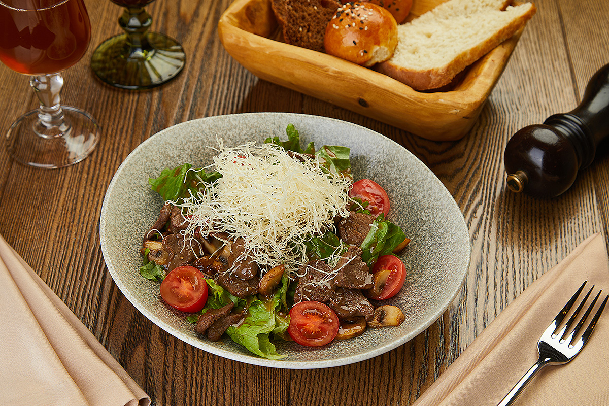 Сочетание филе изюбра, солёных грибочков, свежего и маринованного огурчика, отварного картофеля, зелени. Заправляется оливковым маслом.
